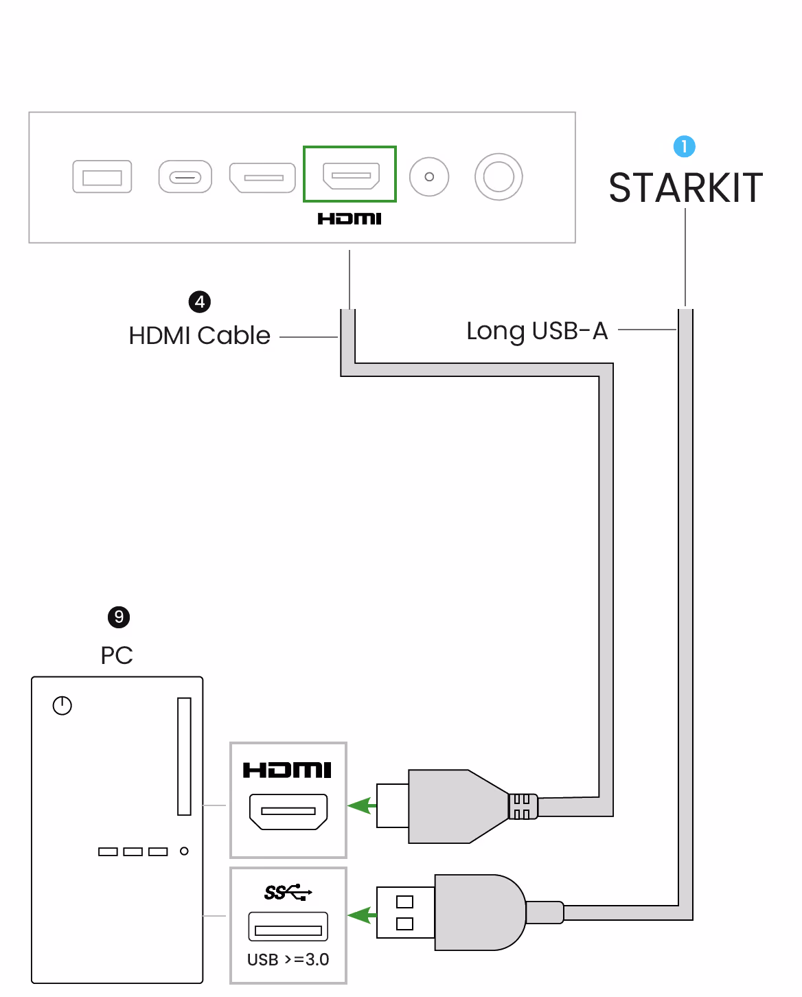 Connect the long (1) USB-A and (4) HDMI cable into the (9) PC.