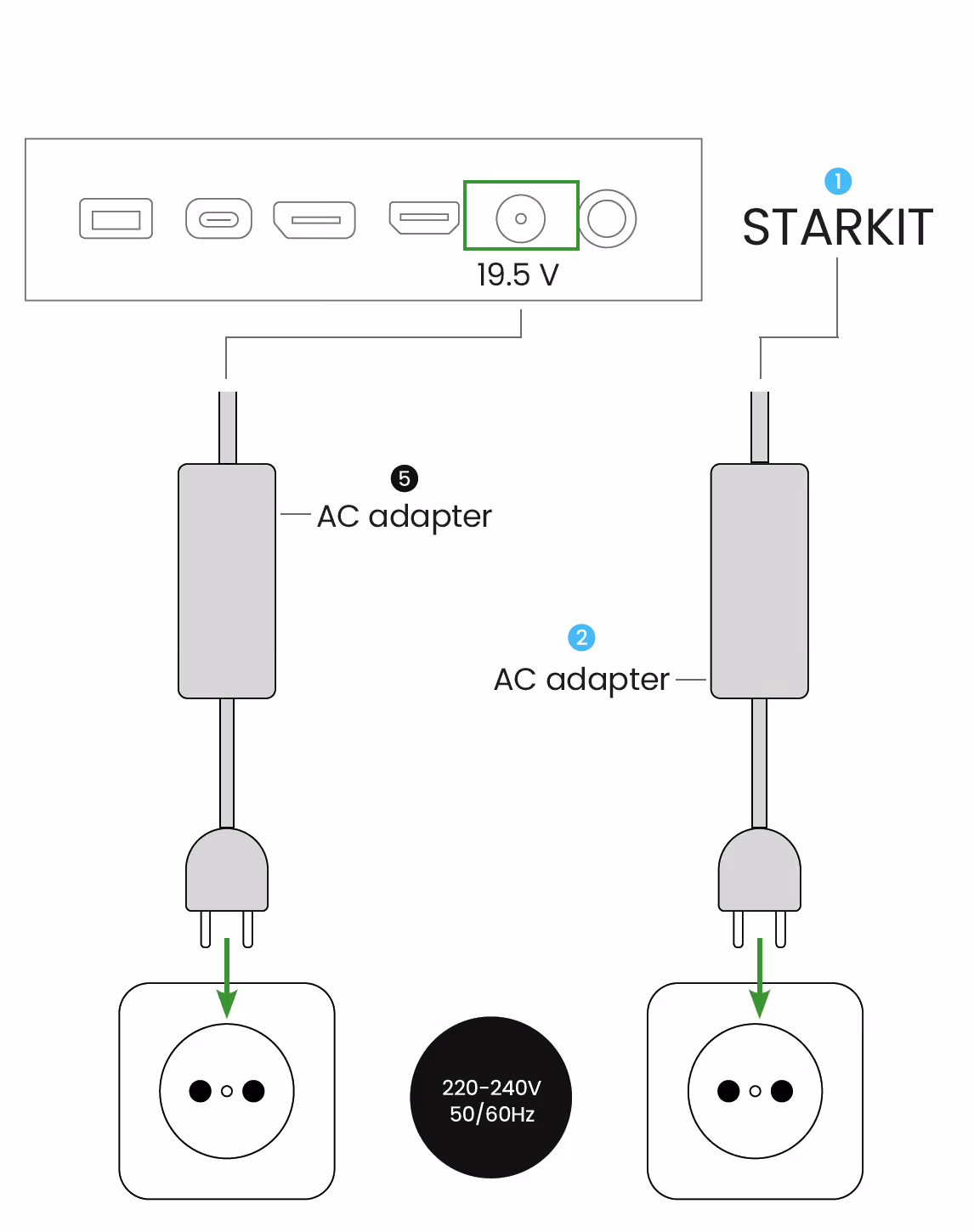 Plug (2) AC Adapter connection into the (1) STARKIT USB-hub.